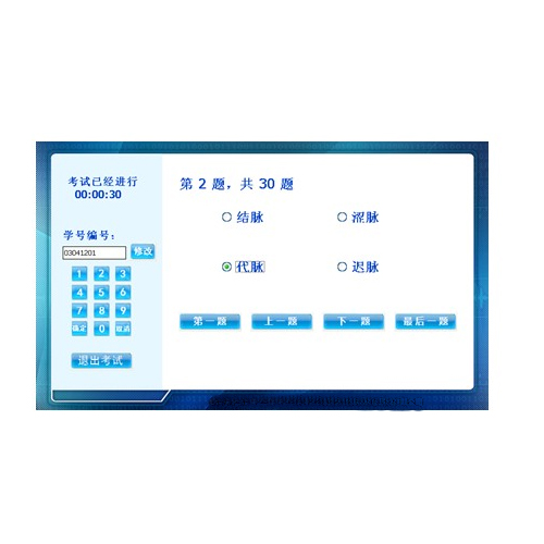 在與教師機聯網后,可進行脈象考試:教師機上可進行考卷和試題的編輯、下發(fā),在學生機上進行答題;最終在教師機自動統計分數;