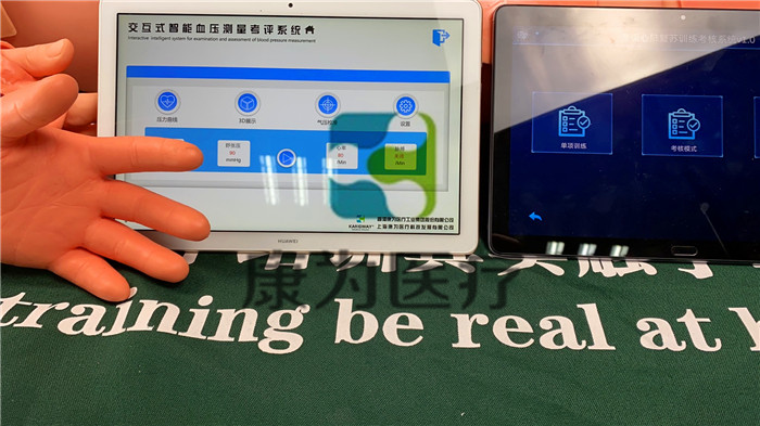 4.1血壓考評系統(tǒng)基于移動終端的血壓監(jiān)測,模型可與移動端平板無線連接,連接成功后可通過平板電腦進行訓(xùn)練和考核,可以進行智能血壓測量軟件交互式訓(xùn)練和血壓模型的實訓(xùn)。