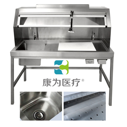 “康為醫(yī)療” 高級多功能不銹鋼取材臺根據(jù)公安部一級示范刑事科學(xué)技術(shù)解剖室建設(shè)要求專門設(shè)計,執(zhí)行中華人民共和國公安部GA/T750-2008不銹鋼尸體解剖臺標準研制生產(chǎn)。采用不銹鋼材質(zhì)模壓成形,精工制作,耐酸耐堿,并具有抽風(fēng)、解剖雙重功能,整體造型豪華大氣。