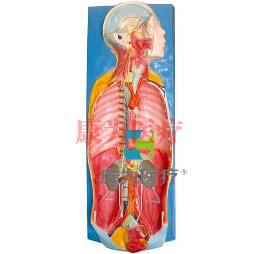 自主神經(jīng)解剖模型主題為人體的頭頸及軀干,頭部作矢狀切面至眉弓高度作水平切,顳下部除去上方的顴弓,顳下部的腮腺及部分軟組織,頸部示剝離軟組織,胸腹部沿腋前線削開胸腹壁,除去胸腹腔內(nèi)臟,保留氣管、主動脈、腎、腎上腺以及直腸。
