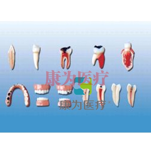 牙齒病變系列模型由健康牙齒與牙髓炎、牙周炎、齲齒等病牙以及作好充填準備的牙齒、已用銀汞合金充填的牙齒等12個部件組成,并顯示健康牙齒與牙髓炎、牙周炎、齲齒等病理形態(tài)以及臨床治療方法。