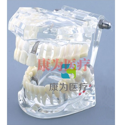 種植修復(fù)模型展示的是前牙種植,樁核修復(fù),瓷貼面,下后牙種植后連橋修復(fù);上后牙,全瓷冠連橋修復(fù),牙結(jié)石,牙齦萎縮,馬利蘭橋;淺齲、深齲及根端囊腫,阻生齒。