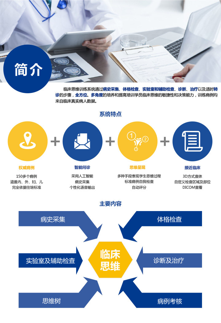 臨床思維訓練考核能力是每一名醫(yī)生在成長過程中需要不斷學習提高的,也是醫(yī)學生實習階段訓練的重點和難點。國內(nèi)的醫(yī)學教材多從疾病入手,而從癥狀入手、采用循序漸進(step by step)的病例分析方法直接輔導醫(yī)學生臨床思維能力養(yǎng)成,臨床思維訓練考核教學軟件,以培養(yǎng)醫(yī)學生和年輕醫(yī)生縝密的臨床思維能力為目的,在北京大學第三醫(yī)院、協(xié)和醫(yī)院、天津人民醫(yī)院等專家指導下開發(fā),且所有訓練考核案例都是專家編寫。