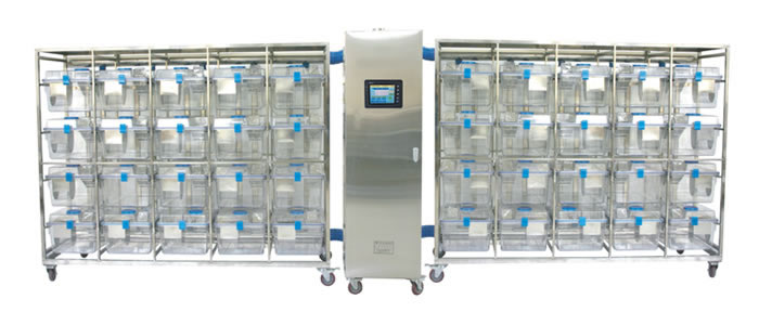 07.采用靜壓微風(fēng)技術(shù),對每個籠盒獨(dú)立送氣,防止交叉感染;籠架上設(shè)置有進(jìn)出風(fēng)關(guān)閉閥,主機(jī)可自動調(diào)節(jié)每盒的風(fēng)速,使整架每個籠盒的壓差均勻;