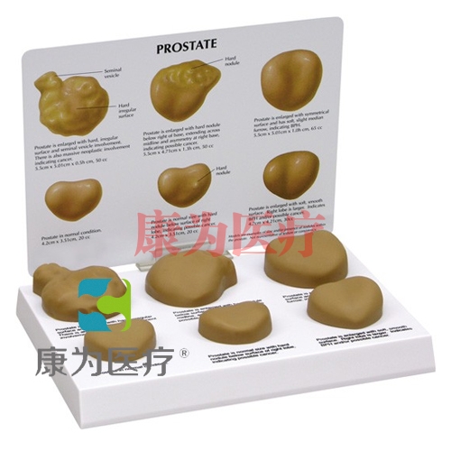 前列腺病變模型所示包括:正常前列腺; 正常大小前列腺與右結(jié)節(jié)表面之下硬結(jié)節(jié); 前列腺增大的右葉; 前列腺增大,對(duì)稱的表面,略中間的犁溝; 前列腺增大,右側(cè)基底下方硬結(jié)節(jié); 具有硬不規(guī)則表面和精囊參與的前列腺肥大。