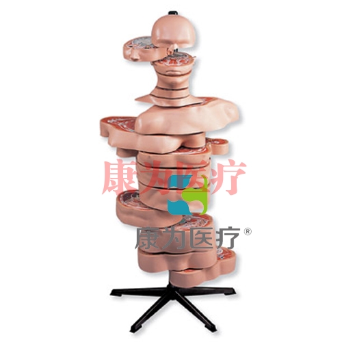 這款獨(dú)特的軀干模型水平分割成15片。各片的平面上用色彩區(qū)分表示了各組織的關(guān)系。為作進(jìn)一步的研究,每片可水平推移并沿縱軸旋轉(zhuǎn)。各片都可單獨(dú)拆卸。