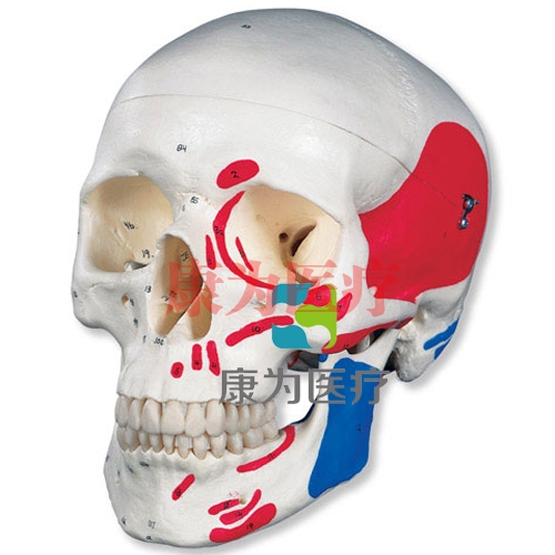 左半邊頭顱用色彩標(biāo)明,肌底端(紅色)和附著?。ㄋ{(lán)色)。右半邊用數(shù)字標(biāo)明顱骨和結(jié)構(gòu)。此顱模型逼真再現(xiàn)了140多個(gè)解剖細(xì)節(jié)。 高質(zhì)量的原型,用堅(jiān)固不碎的硬塑料手工制成,高度精確地展示了小腦溝、孔、突、骨縫等 ?可分拆成顱蓋、顱底和下頜骨。作為一種考慮,您還可將我們的“5部分腦模型(C18)”嵌入。