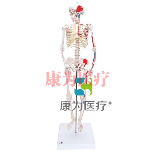 與1000039一樣是迷你骨骼模型。不同的是,該模型的左半部裝有肌肉模塊,并顯示肌肉的起始段(紅色)和終止端(藍色),肌肉還編有號碼以供識別。