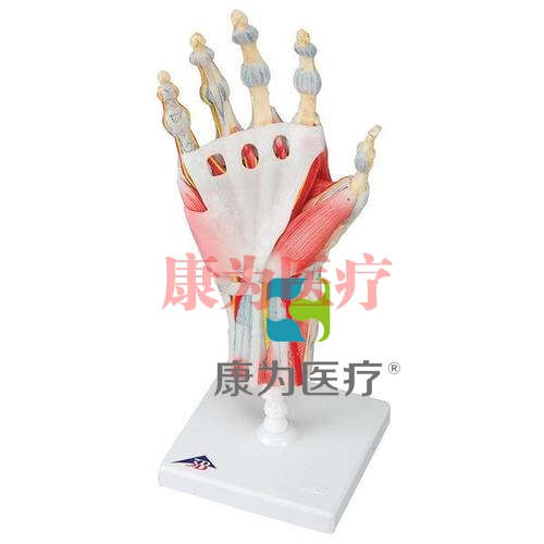 本產(chǎn)品制作精良,為手與前臂低位的四分體模型,可清晰地顯示骨、肌肉、肌腱、韌帶、神經(jīng)以及動(dòng)靜脈等結(jié)構(gòu)。 模型的背面可見(jiàn)伸肌以及走行于腕部伸肌支持腱之下的部分肌腱。 該模型的手部掌面可見(jiàn)三層結(jié)構(gòu)組成,上面的兩層拆開(kāi)后即可見(jiàn)深部的第三層解剖結(jié)構(gòu)。也可見(jiàn)到具有重要臨床意義的解剖細(xì)節(jié)結(jié)構(gòu)如正中神經(jīng)與淺層掌動(dòng)脈弓等。 解剖深層結(jié)構(gòu)中可見(jiàn)內(nèi)附肌、掌深動(dòng)脈弓以及其它的解剖細(xì)節(jié)。