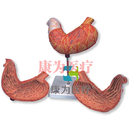 這款模型展示了胃壁的各個(gè)層面,前半胃可拆下。表現(xiàn)的是: 食管下部,血管 ,神經(jīng)置于基架上供貨。