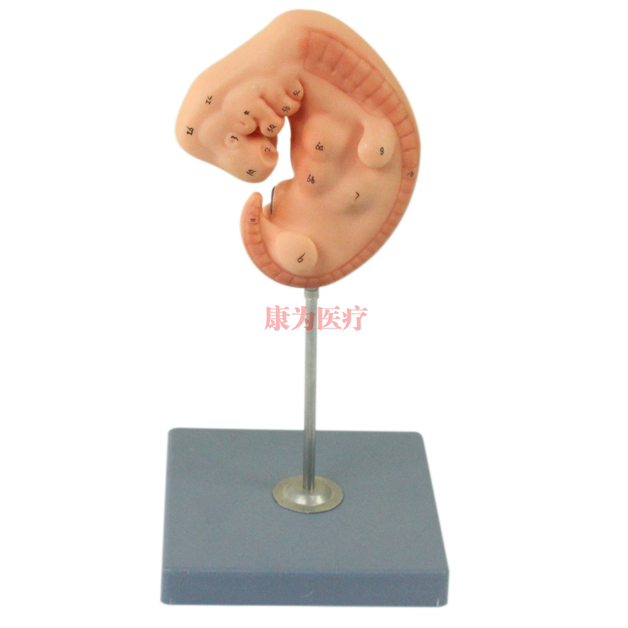 ●該模型為胚胎第4周大小,顯示額鼻突、鼻板、視杯、端腦、中腦、菱腦、神經(jīng)管、心球、心室、肝、上、下肢芽等結(jié)構(gòu),共有12個(gè)部位指示標(biāo)志