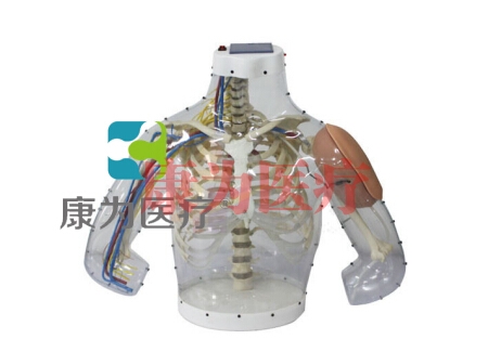 模型為成人上半身,一側(cè)為透明區(qū)域,可以觀察內(nèi)部(骨骼、血管、神經(jīng))解剖結(jié)構(gòu),便于操作定位